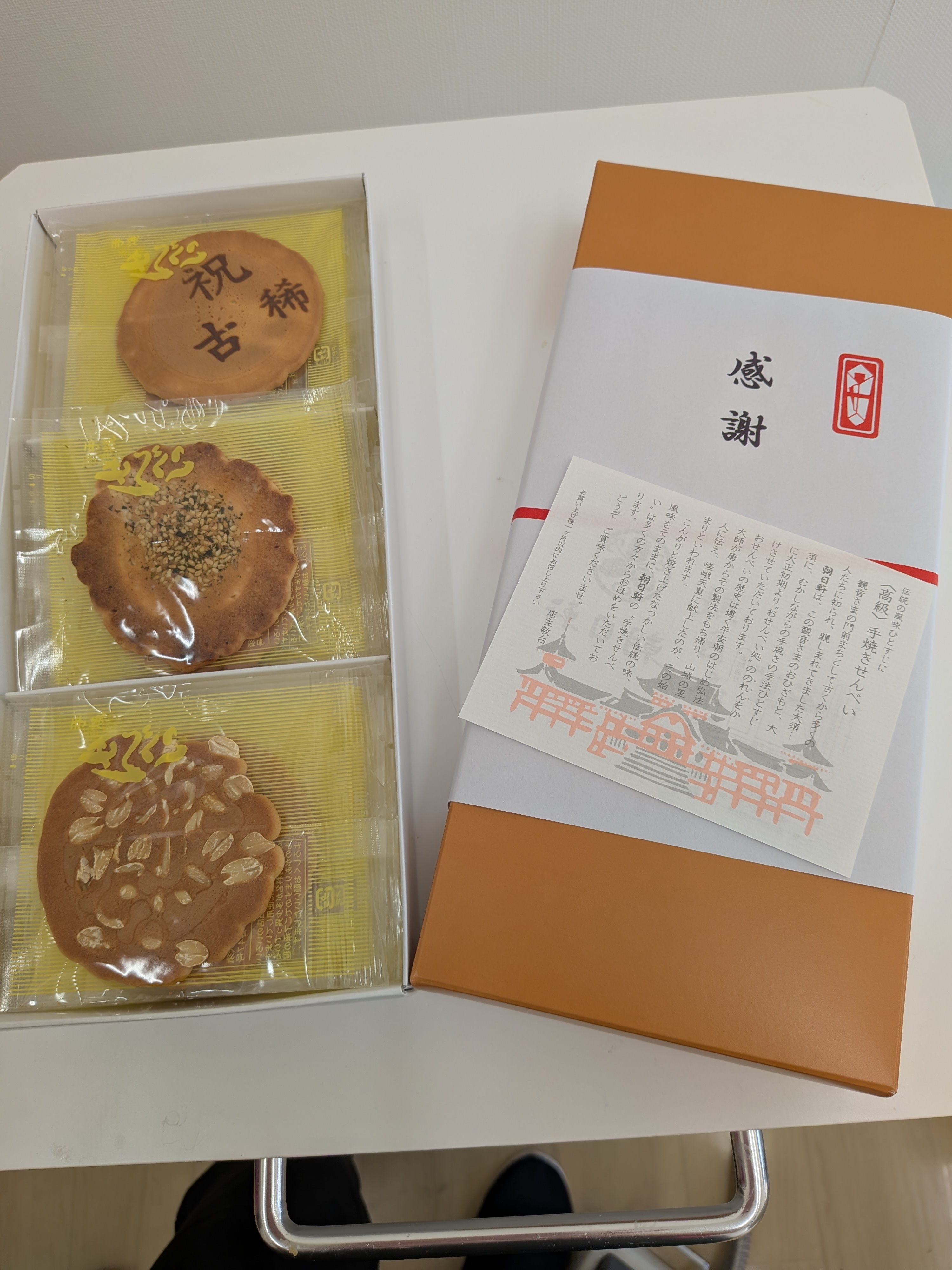 こんにちは。患者様A様が古稀を迎えられ、お祝いで作ってもらったというおせんべいをどうぞといただきました(^-^)お元気に古稀を迎えられてすばらしいです!!次は8020を目指していただきたいと思います!(^^)!記念のおせんべいありがとうございます。私達も古稀目指します!!